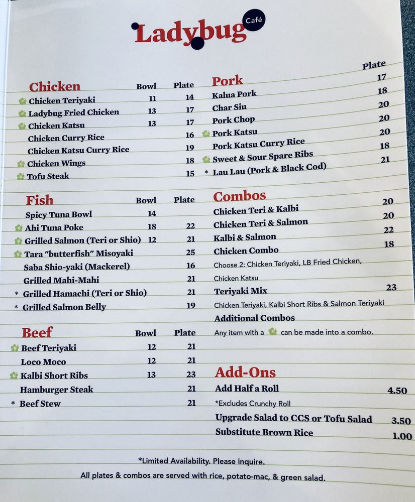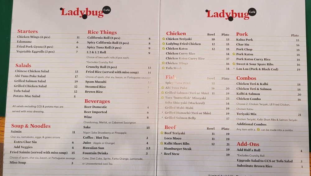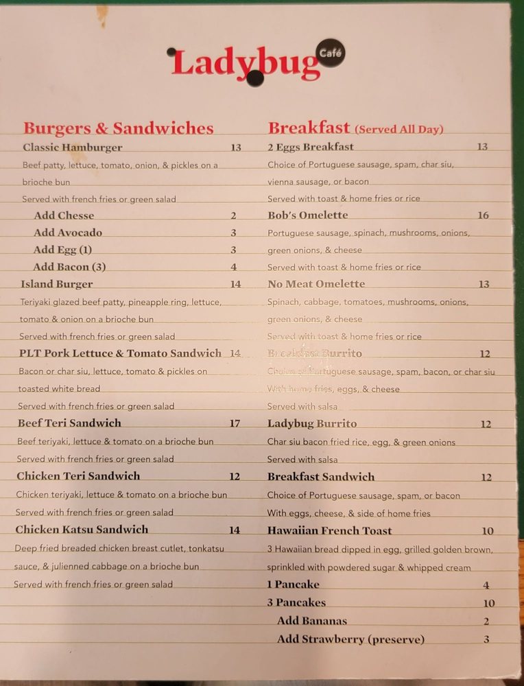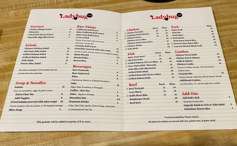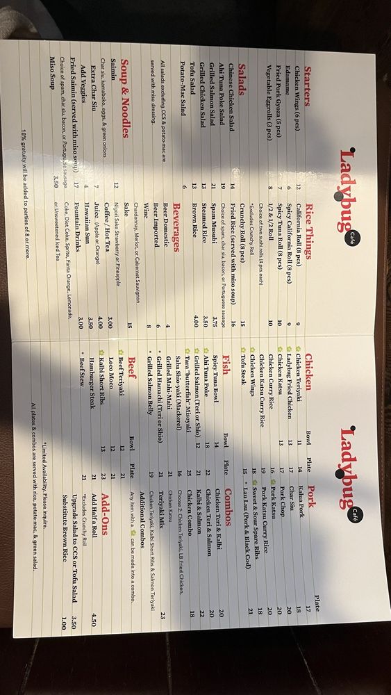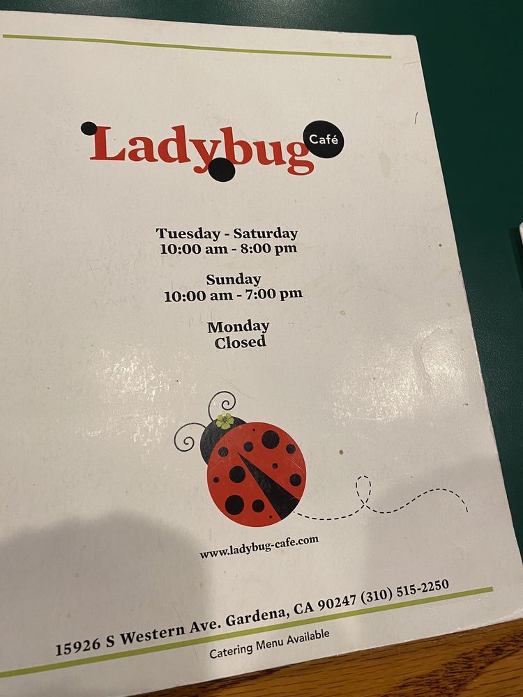 Ladybug Café, located in Gardena, CA, offers a delightful Asian Fusion - Japanese menu with a range of options catering to various dietary needs, including vegan and vegetarian choices. The restaurant provides a casual atmosphere with excellent service and a Hawaiian-inspired ambiance that transports you to the islands. Customers rave about the crispy and flavorful dishes, such as curry pork tonkatsu and Hawaiian fried chicken, served with traditional sides like rice, mac salad, and fresh salad. The quality of ingredients, portion sizes, and communication with staff consistently impress diners, making Ladybug Café a go-to spot for those craving delicious Hawaiian flavors. With amenities like delivery, takeout, and outdoor seating, Ladybug Café ensures a memorable dining experience for everyone.