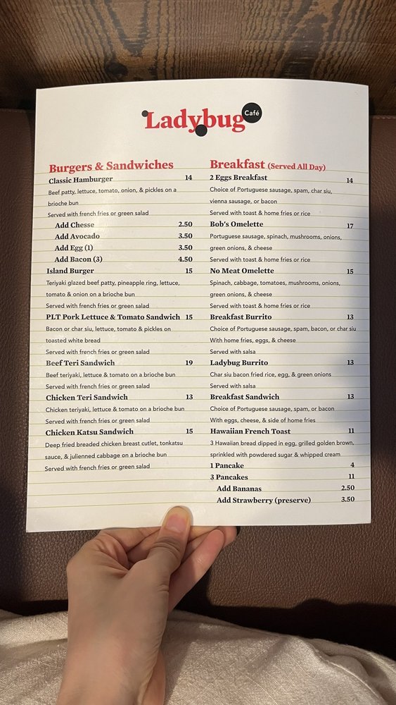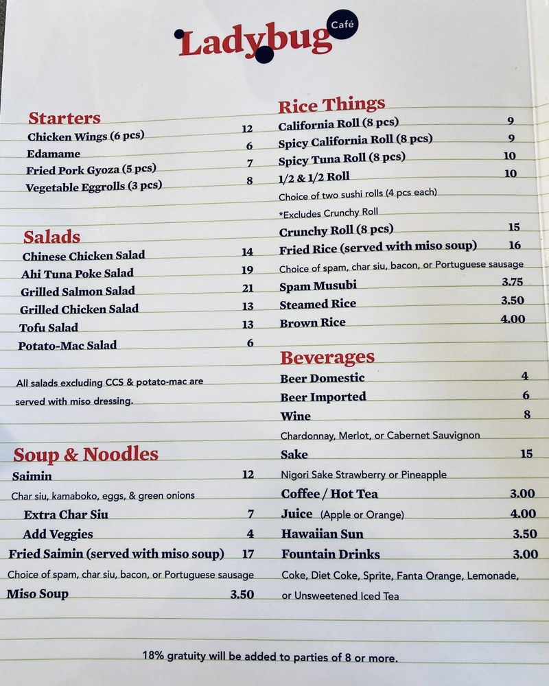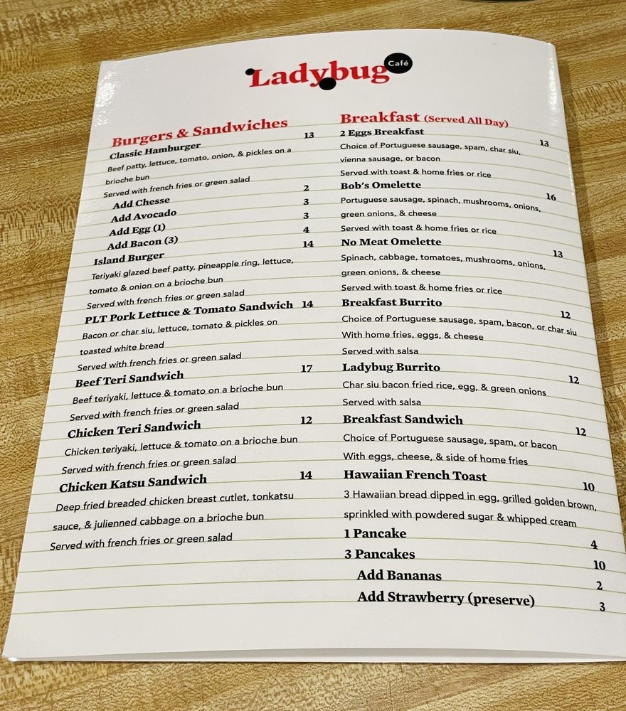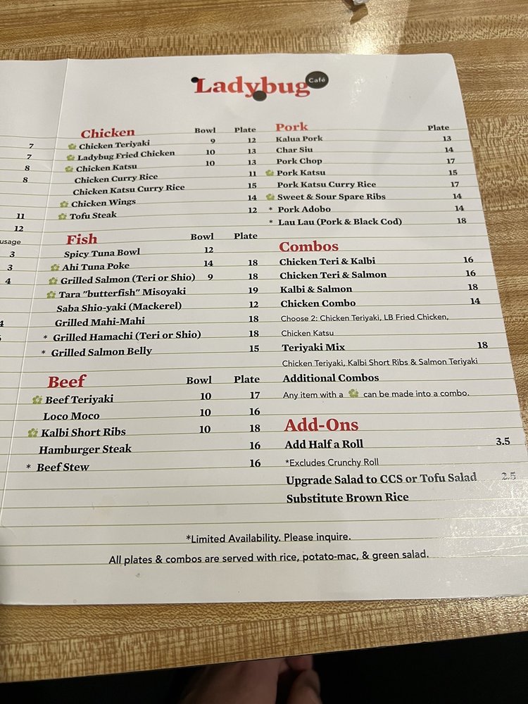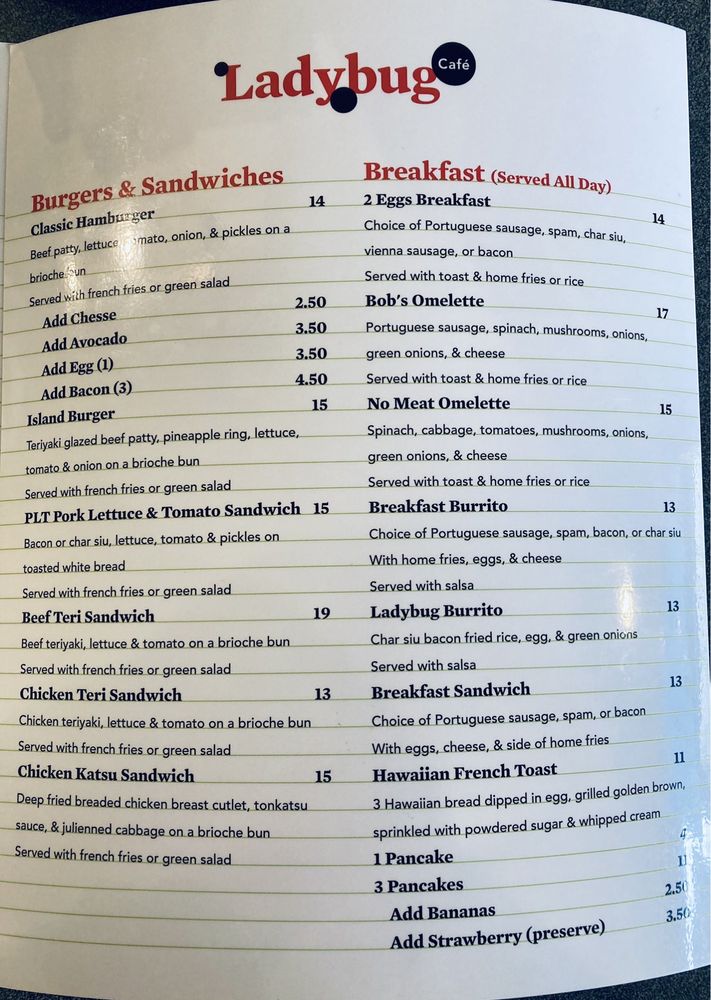 Ladybug Café, located in Gardena, CA, offers a delightful Asian Fusion - Japanese menu with a range of options catering to various dietary needs, including vegan and vegetarian choices. The restaurant provides a casual atmosphere with excellent service and a Hawaiian-inspired ambiance that transports you to the islands. Customers rave about the crispy and flavorful dishes, such as curry pork tonkatsu and Hawaiian fried chicken, served with traditional sides like rice, mac salad, and fresh salad. The quality of ingredients, portion sizes, and communication with staff consistently impress diners, making Ladybug Café a go-to spot for those craving delicious Hawaiian flavors. With amenities like delivery, takeout, and outdoor seating, Ladybug Café ensures a memorable dining experience for everyone.